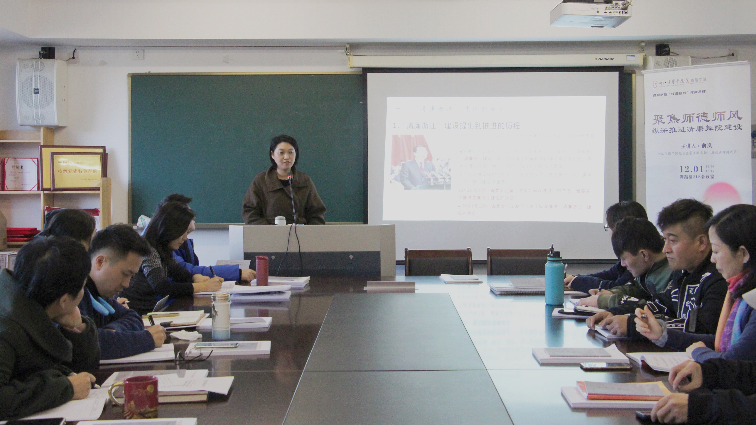 作者:孫慧 來源:舞蹈學院 發(fā)布時間:2021-12-03為貫徹落實好第二屆師德師風建設主題教育月活動相關精神,進一步提升教師師德修養(yǎng),12月1日下午,舞蹈學院舉辦了師德師風專題講座和青年教師座談會。浙江傳媒學院紀檢監(jiān)察室副主任、廉政講師團成員俞嵐應邀作《以師德師風建設為關鍵 縱深推進清廉舞院建設》專題輔導報告,舞蹈學院黨總支書記、副院長葉堅琳主持,舞蹈學院全體教職工參加。
