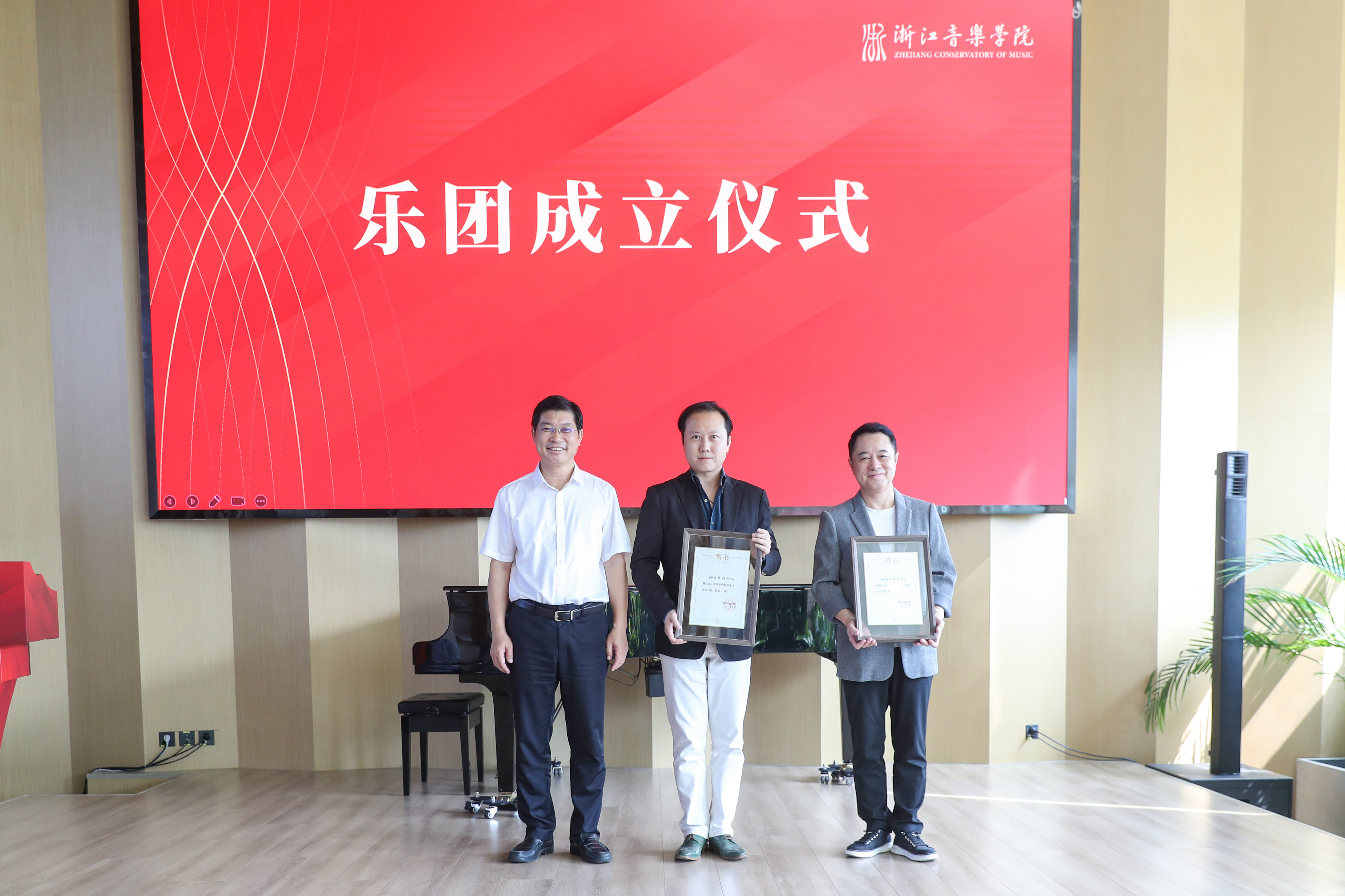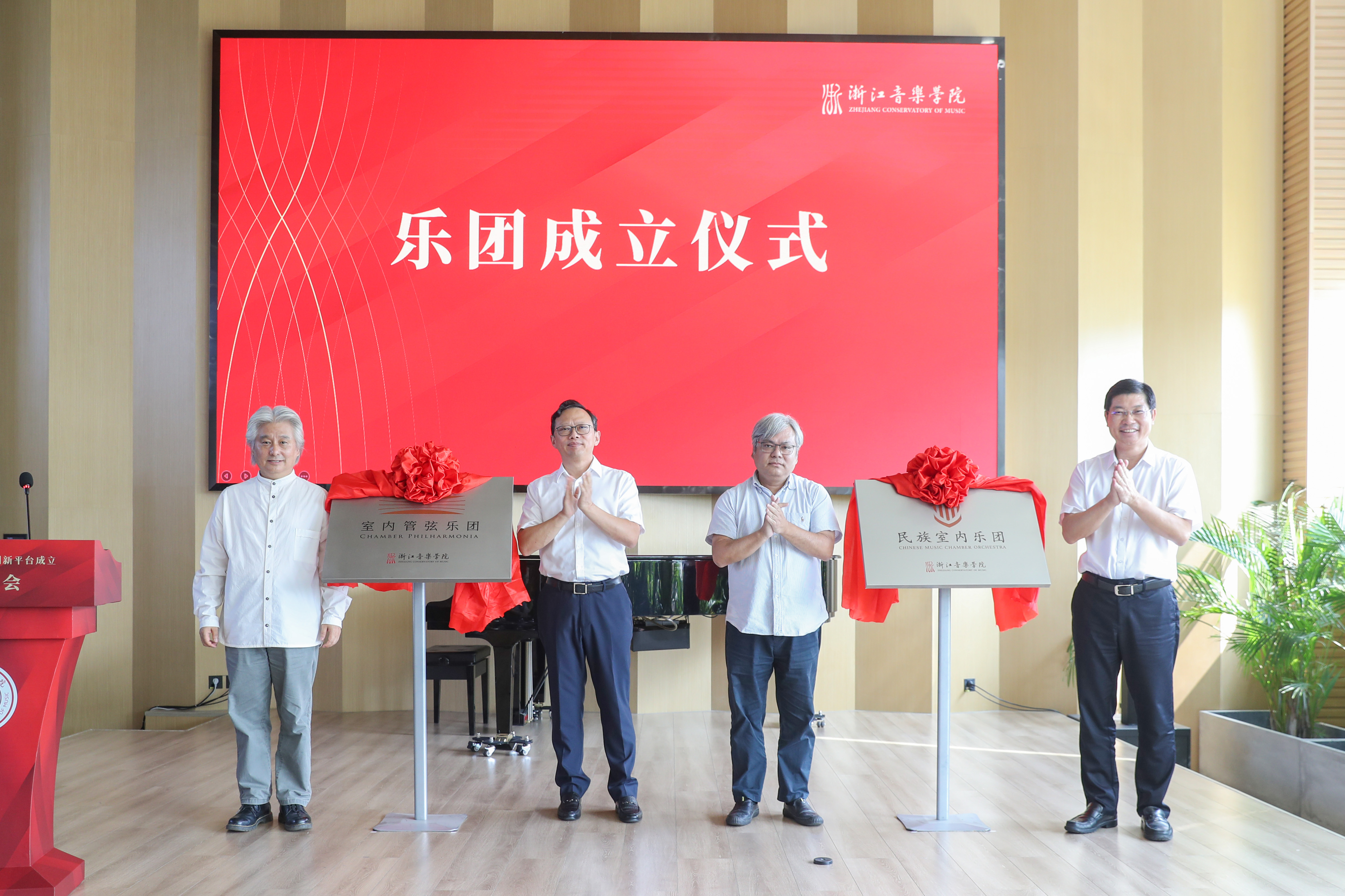 柳河、干武東、王瑞、楊九華共同為浙江音樂學(xué)院民族室內(nèi)樂團、室內(nèi)管弦樂團揭牌