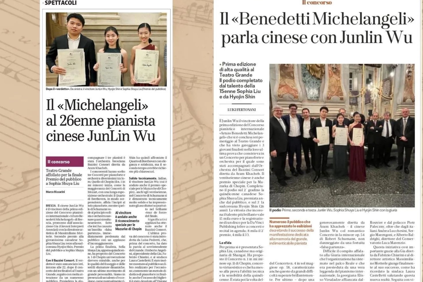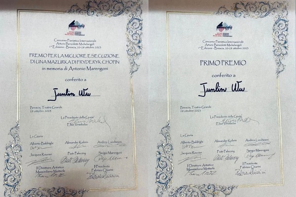 第一屆米開朗杰利國際鋼琴比賽由意大利公益組織Giovani Interpreti Associati(Young Interpreters Association)主辦,由數(shù)位國際頂尖鋼琴家、鋼琴教育家擔(dān)任評(píng)委。大賽匯聚了來自世界各地的一流音樂家參賽,在選手組成規(guī)模、比賽規(guī)定時(shí)長、輪次和曲目設(shè)置、評(píng)委陣容等方面,均達(dá)到了國家文化部評(píng)定的國際A類賽事級(jí)別。在此次比賽中,吳君麟與來自世界各地的36名優(yōu)秀鋼琴家同臺(tái)競技,歷經(jīng)四輪激烈的角逐,最終以精湛的技藝和卓越的才華打動(dòng)了現(xiàn)場評(píng)審團(tuán),斬獲賽事第一名和最佳肖邦瑪祖卡獎(jiǎng),同時(shí)還贏得2024年、2025年歐洲巡演鋼琴獨(dú)奏會(huì)、意大利布雷西亞交響樂團(tuán)樂季開幕式演出,以及與達(dá)芬奇唱片公司合作錄制專輯等機(jī)會(huì)。此次獲獎(jiǎng)是學(xué)院鋼琴系近年來所取得的最高規(guī)格、最高標(biāo)準(zhǔn)的國際權(quán)威賽事冠軍。