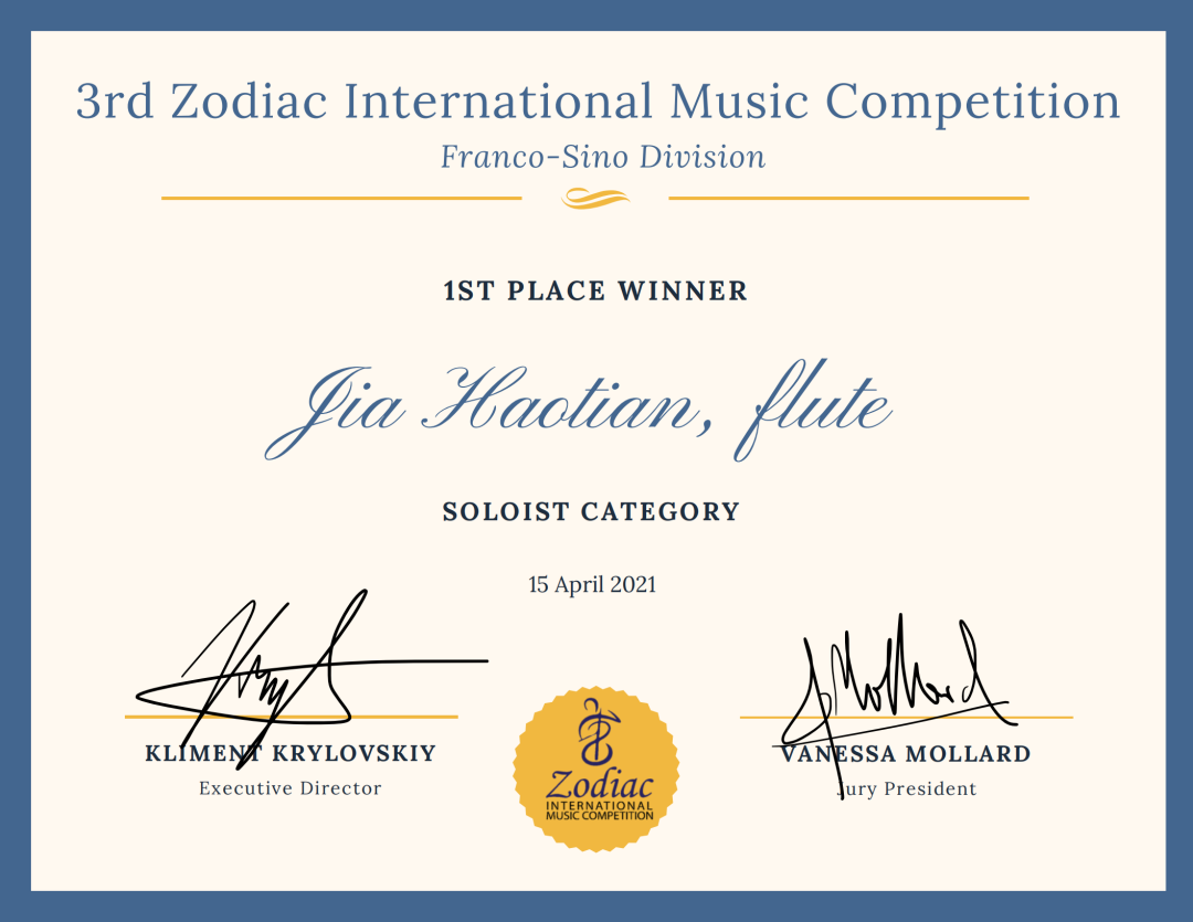 近日,2021法國尼斯Zodiac音樂家和作曲家國際大賽線上比賽落下帷幕。室內樂學院學員、管弦系18級長笛學生賈淏天在大賽中榮獲一等獎。