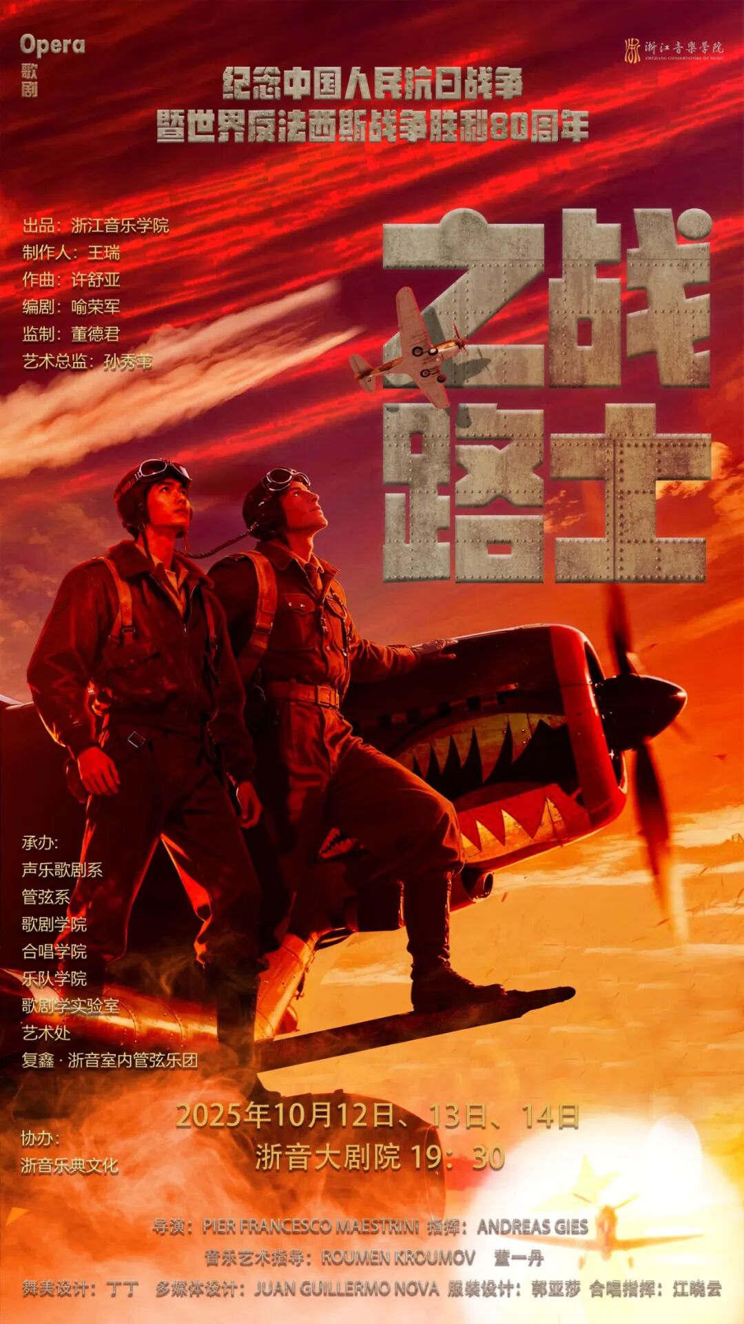 偉大的中國人民抗日戰(zhàn)爭開辟了世界反法西斯戰(zhàn)爭的東方主戰(zhàn)場,為世界反法西斯戰(zhàn)爭勝利作出了重大貢獻(xiàn)和犧牲。歌劇《戰(zhàn)士之路》為紀(jì)念中國人民抗日戰(zhàn)爭暨世界反法西斯戰(zhàn)爭勝利80周年而作,全景式展現(xiàn)了1937年至1945年間,中美兩國軍民并肩戰(zhàn)斗共同抗擊日本法西斯侵略的壯麗史詩。全劇以磅礴的史詩筆觸再現(xiàn)了以陳納德為代表的飛虎隊員在中國戰(zhàn)場英勇戰(zhàn)斗的傳奇故事,以戰(zhàn)地記者陳香梅的視角揭開了歷史的面紗——戰(zhàn)火硝煙中的長空誓言既是兩人熾熱的愛情誓約,更是中美軍民并肩抗擊侵略的生死盟誓。讓我們走進(jìn)劇場,聆聽和感受那段用生命譜寫的恢弘篇章,見證歷史星空中永不隕落的正義、忠貞與勇氣。