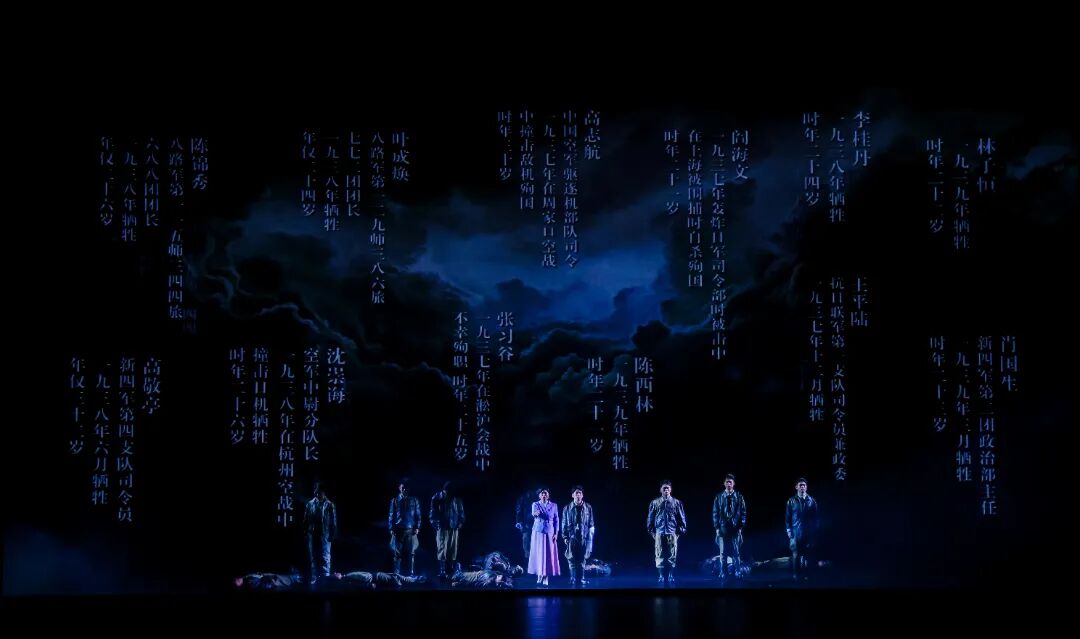 “本劇情景多、變化頻繁、多時(shí)空并列,遷換需要快速高效。”丁丁介紹,為此,他在舞臺(tái)三分之一深處,設(shè)置了一組可以開合的“云”景片,在深度上分割舞臺(tái)空間,功能上則保證前區(qū)演出時(shí)后區(qū)換景的遮擋需要,“云開云合”完成瞬間的空間重組、傳遞信息和情感,增強(qiáng)藝術(shù)感和觀賞性。加之現(xiàn)場以冷峻的鋼鐵結(jié)構(gòu)象征戰(zhàn)爭的殘酷與男性的陽剛,配合多媒體技術(shù)營造空戰(zhàn)的激烈效果,最終呈現(xiàn)極具沖擊力的視覺畫面。