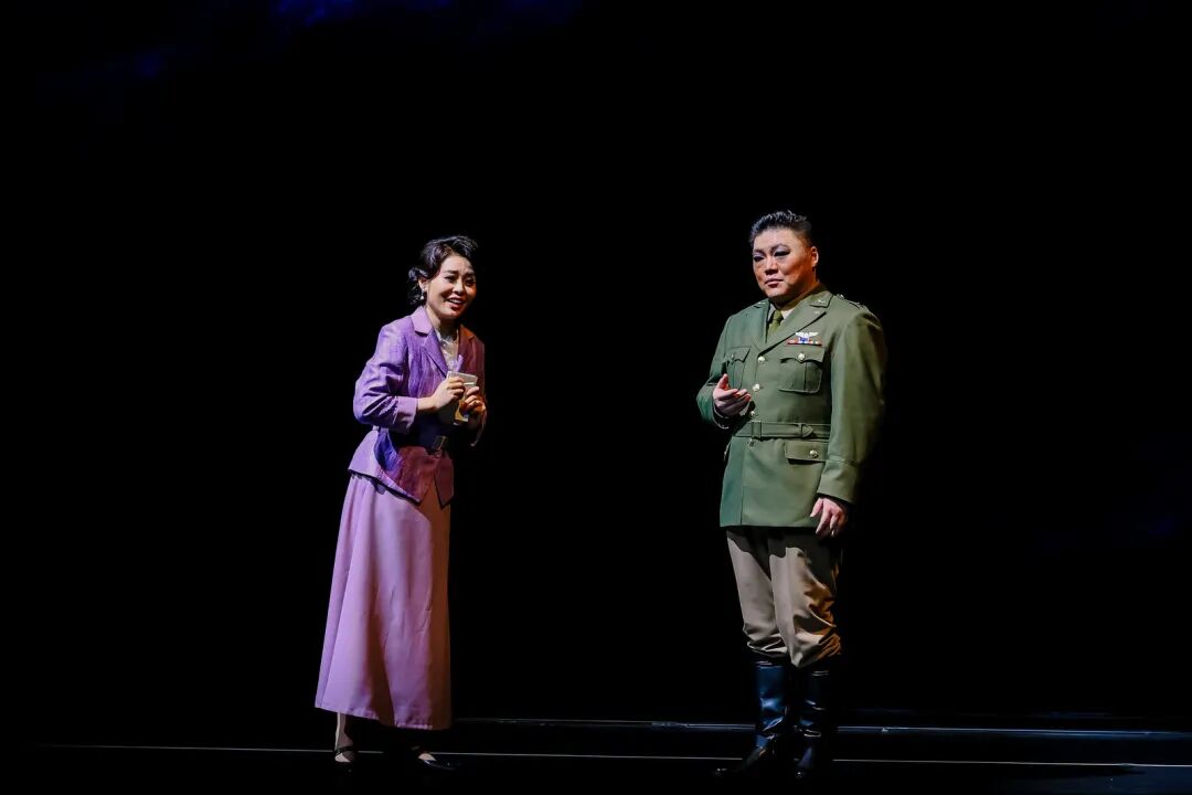 該劇對(duì)歷史人物進(jìn)行了深入肌理的刻畫。飾演陳納德的男高音歌唱家韓蓬,為角色傾注了大量心血。“我深知這不僅僅是在扮演一位歷史英雄,更是在詮釋一段跨越國界的勇氣、責(zé)任與人性糾葛的史詩。”他通過大量閱讀史料、觀摩影像,觀察其走路的姿態(tài)、說話的神情、微笑的樣子,甚至“眼神中那種混合著堅(jiān)毅、疲憊與執(zhí)著的獨(dú)特氣質(zhì)”,力圖還原一個(gè)“有決心、有焦慮、有柔情、有反思”的復(fù)雜個(gè)體。“陳納德是一個(gè)在極端環(huán)境下,被責(zé)任、勇氣和巨大犧牲所塑造的、充滿悲劇色彩的英雄。因此在我看來,表演不在于唱出多么震撼的高音,而在于是否讓觀眾相信,舞臺(tái)上的我就是那個(gè)在歷史的十字路口,背負(fù)著沉重使命,卻依然選擇為信念而飛的‘飛虎將軍’。”
