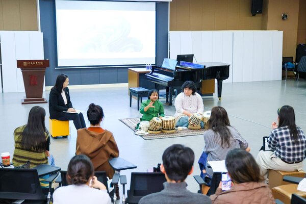 Bivakar Choudhury教授帶來的印度塔布拉鼓工作坊同樣精彩。他從印度塔布拉鼓的由來講起——羊皮蒙面、雙音變幻,娓娓道出鼓樂與信仰的千年淵源。隨后,他講述了印度音樂中獨具魅力的“汀塔拉”節(jié)奏,引領(lǐng)學(xué)員步入那片色彩斑斕、充滿異域風(fēng)景的韻律秘境。在互動環(huán)節(jié),他帶領(lǐng)學(xué)生嘗試擊打出陌生卻迷人的節(jié)拍,仿佛跟隨時光的駝鈴,踏上了一場穿越絲路的音樂之旅。“這個工作坊像一場文化的探險,讓我們在節(jié)奏的縫隙中,聆聽不一樣的東方智慧,感受音樂與天地的共鳴回響。”