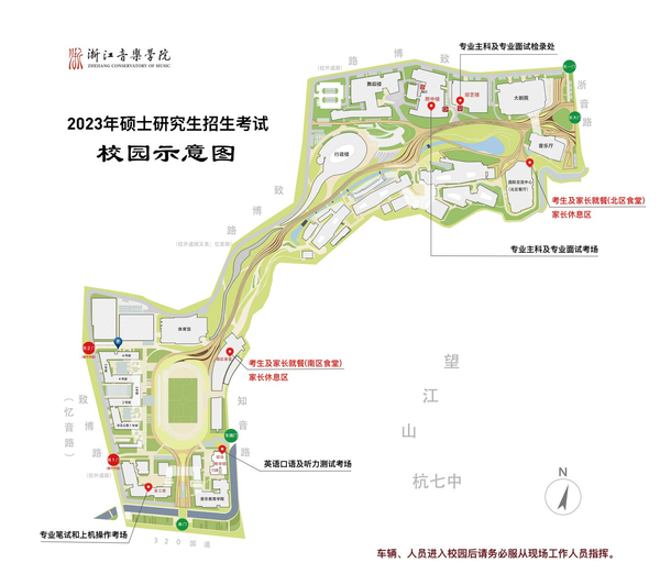 5.如需自駕車輛進入考點,請聽從指揮,將車輛停放地下車庫,臨時接送車輛即停即走;學校周邊交通路況復雜,請考生及時了解杭州市區(qū)車輛限行規(guī)定,選擇合適的交通工具提前出行,以免誤考。考試當天6:30后考生、家長方可進入校園。在綜藝樓(附中樓)參加考試的考生,建議從浙音路東1門(行車道)或東大門(人行道)進入校園;在南區(qū)綜合教學樓15A、15B參加考試的考生,請從南門進入校園。如乘坐地鐵6號線到浙江音樂學院站,可從320國道“浙江音樂學院南門”進入校園。