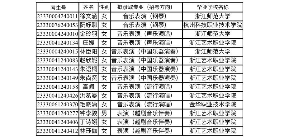 附表2:浙江音樂學(xué)院2023年“專升本”擬錄取名單