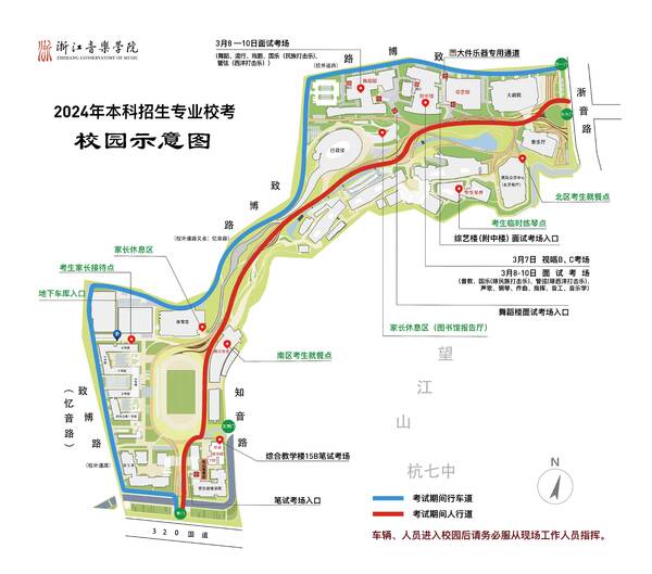 3月7日—10日,學(xué)校開放東1門、東大門、南門、東南門,在綜藝樓(附中樓)、舞蹈樓參加面試考試的考生,建議從浙音路1門(行車道)或東大門(人行道)進入校園;在南區(qū)綜合教學(xué)樓15B參加筆試考試的考生,建議從南門、東南門進入校園。如乘坐地鐵6號線到浙江音樂學(xué)院站,可從知音路“浙江音樂學(xué)院東南門”進入校園。