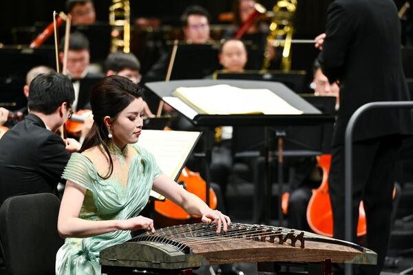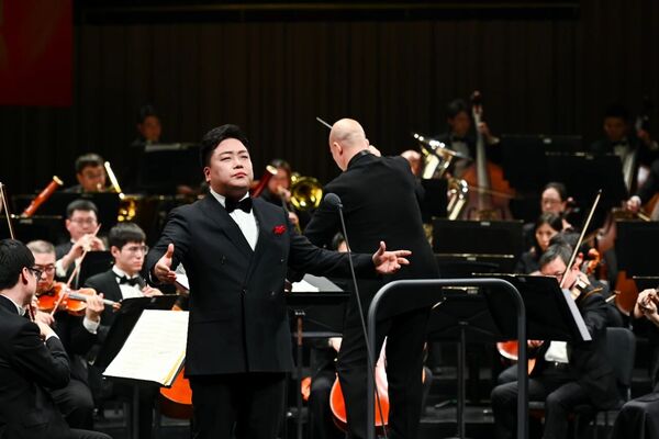 音樂會以一曲激昂的《魯斯蘭與柳德米拉》序曲激昂開篇。隨后,古箏協(xié)奏《望云賦》以清透靈動的音韻勾勒出云卷云舒的東方意境,而歌劇選段《愛永在》則以深情的旋律吟詠出真摯雋永的家國情懷。琵琶協(xié)奏《絲路飛天》以繁復(fù)的指法與豐富的音色變化,再現(xiàn)絲綢之路上的風(fēng)物與遐思?!而B兒在風(fēng)中歌唱》以極具藝術(shù)感染力的演繹,將深切而克制的悲情浸透于每個音符之中,直抵人心;《苗嶺飛歌》則一轉(zhuǎn)情緒,以清亮悠揚的嗓音喚醒山野間蓬勃的生命氣息,宛如晨光穿透層林。鋼琴與樂團奏響《保衛(wèi)黃河》,鏗鏘有力的琴聲如浪潮奔涌,澎湃的激情與厚重的民族氣魄震撼人心。普羅科菲耶夫《第三鋼琴協(xié)奏曲》以現(xiàn)代性的節(jié)奏張力與抒情段落交織呈現(xiàn),展現(xiàn)出技巧與音樂的深度交融。歌劇《塞維利亞的理發(fā)師》選段《快給大忙人讓路》則以詼諧生動的舞臺表現(xiàn)與敏捷華麗的演唱,揮灑出鮮活的戲劇光彩。特別呈現(xiàn)的二重唱《恐嚇吧,激烈的言辭》(選自歌劇《命運之力》),由兩屆“金鐘冠軍”聯(lián)袂演繹,歌聲中激蕩著命運的對抗與交織,張力迭起,將全場情緒推向高潮。