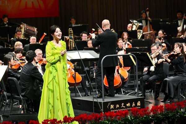 壓軸環(huán)節(jié)尤為精彩。兩屆金鐘冠軍聯(lián)袂演繹歌劇《命運(yùn)之力》二重唱《恐嚇吧,激烈的言辭》,戲劇張力十足,將全場(chǎng)氣氛推向高潮。音樂會(huì)尾聲,浙江交響樂團(tuán)奏響《潮向未來》,以錢塘潮涌為意象,喻示浙江文藝勇立時(shí)代潮頭。最后,全體藝術(shù)家與觀眾齊聲高唱《我和我的祖國》,深情旋律久久回蕩,為音樂會(huì)畫上圓滿句點(diǎn)。