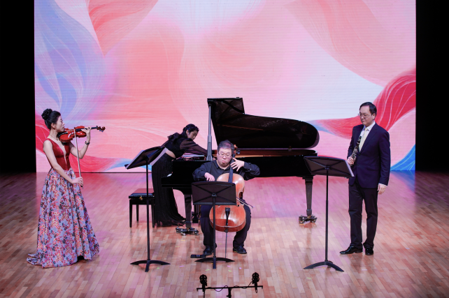 音樂會(huì)演出了5部作品,均為作曲與指揮系副教授、副主任、碩士生導(dǎo)師張澤藝近年創(chuàng)作的室內(nèi)樂新作品。作品在體裁和形式上具有多元性,其中核心作品為2025年國家藝術(shù)基金小型舞臺(tái)資助項(xiàng)目《四季之秋舞》。作品由單簧管教師翟星星、小提琴教師鐘易非、室內(nèi)樂學(xué)院教師張?jiān)磁c藝術(shù)指導(dǎo)齊笑怡共同獻(xiàn)上,將“秋天的舞蹈”這一既有秋日大地多彩樣貌,也流淌著豐收喜悅的意象演繹得生動(dòng)鮮活,獲得了專家和觀眾的一致好評(píng)。