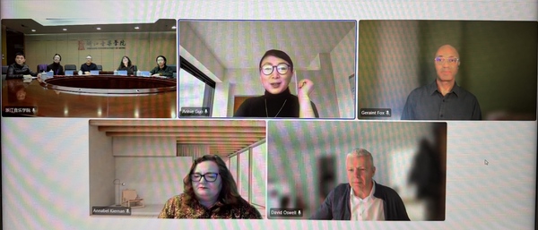 1月29日,浙江音樂學(xué)院與倫敦大學(xué)金史密斯學(xué)院線上會議順利舉行。學(xué)院院長王瑞、倫敦大學(xué)金史密斯學(xué)院校長大衛(wèi)?奧斯韋爾(David Oswell)、副校長安娜貝爾?基爾南(Annabel Kiernan)、國際合作副主管杰蘭特???怂梗℅eraint Fox),舞蹈與表演孔子學(xué)院英方院長、音樂劇專業(yè)負(fù)責(zé)人郭愛萍以及國際交流合作處、音樂劇學(xué)院(籌)相關(guān)負(fù)責(zé)人等參加會議。